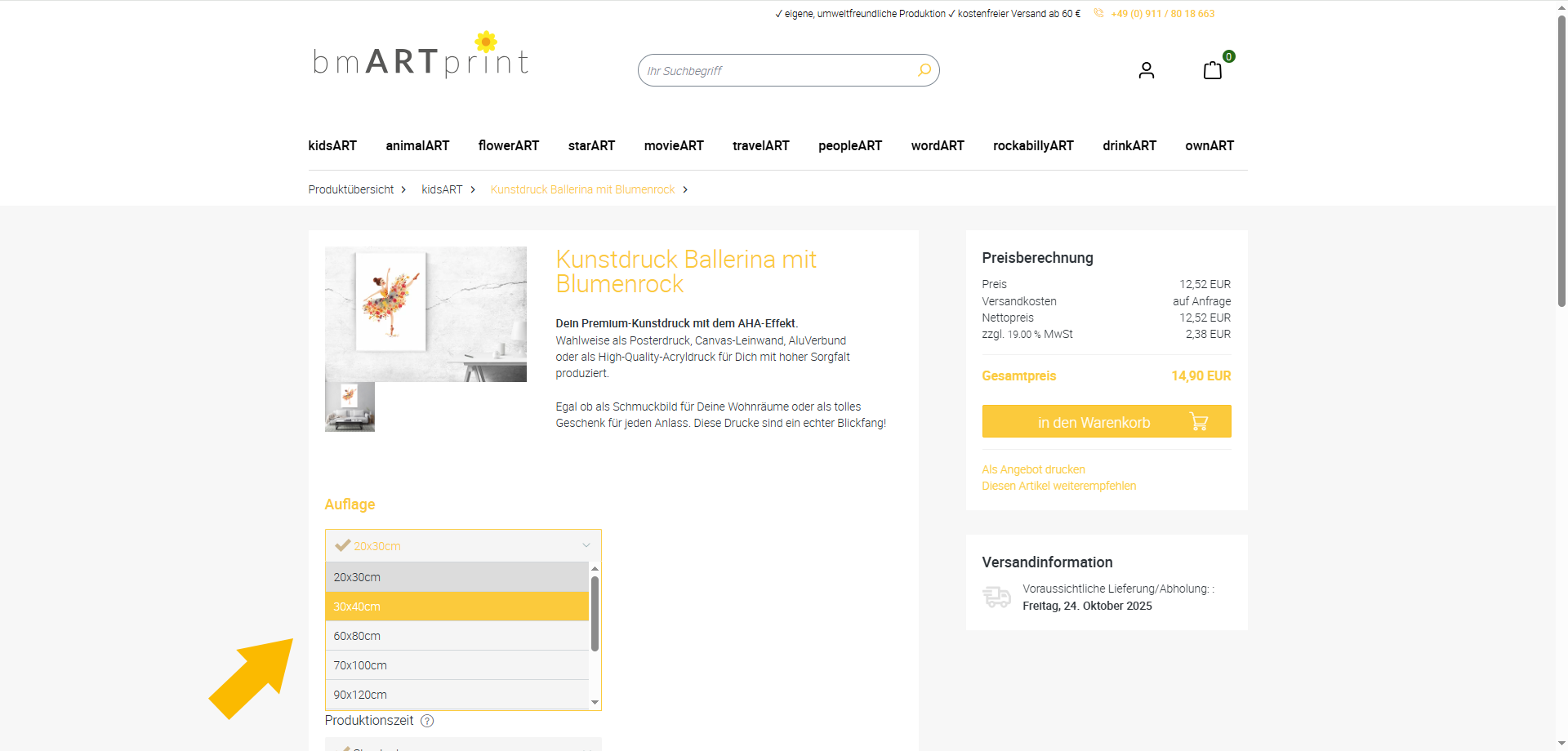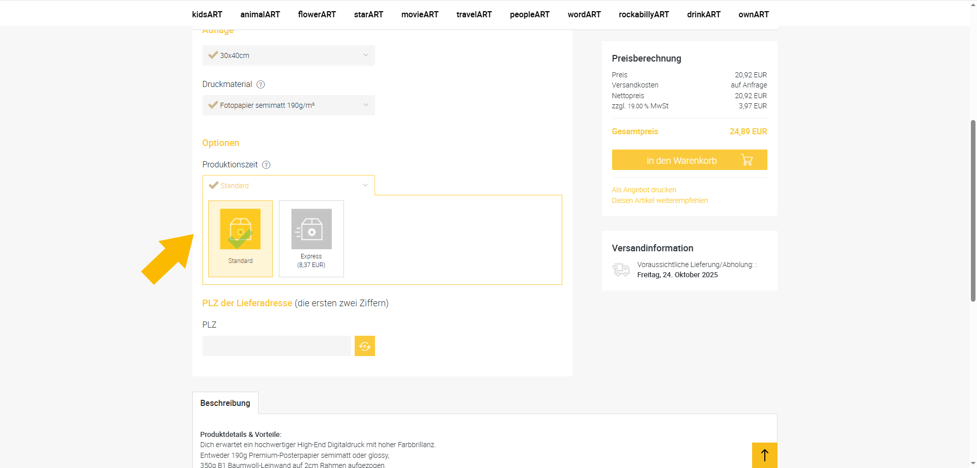 Wenn alle Ihre Angaben zu Ihrer Zufriedenheit sind klicken Sie unter der Kalkulation rechts oben auf den gelbhinterlegten Buttoen in den Warenkorb.