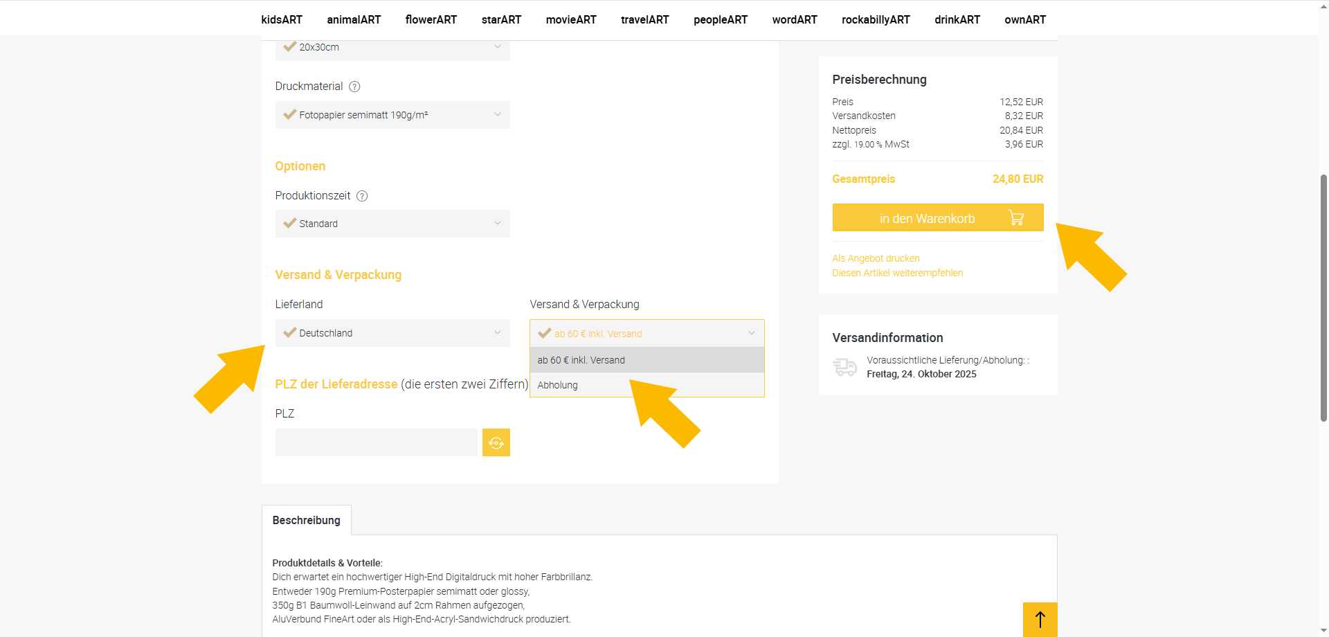 Wenn alle Ihre Angaben zu Ihrer Zufriedenheit sind klicken Sie unter der Kalkulation rechts oben auf den gelbhinterlegten Buttoen in den Warenkorb.